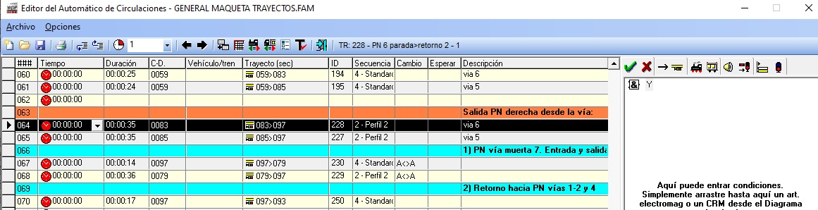 En la línea 4º sitúo el trayecto 087>053 dotado de cambio de sentido de marcha con un camino sucesivo 053>087 para la salida de la vía muerta