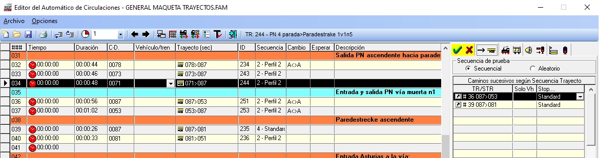 En la línea 3, sitúo el trayecto 071>087 con cominos sucesivos en primer lugar y posición preferente el trayecto retrógrado 087>053 hacia la vía muerta y en segundo lugar el 087>081 hacia la estación secundaria en circulación anterógrada. Señalo que el programa debe elegir en primer lugar el 087>053 (orden secuencial)