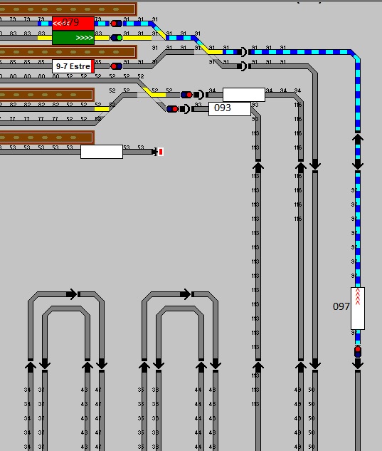 Este es el esquema general de esta vía muerta. En el AC el tren se dirige desde el IV 083 al 097. En este debe escoger preferentemente el trayecto retrógrado 097-079 hacia la vía muerta, invirtiendo la marcha. Sin embargo el AC escoge seguir hacia el IV 093 en circulación anterógrada.